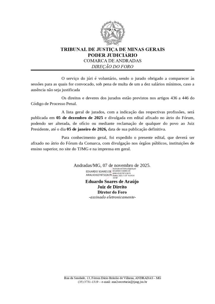 O Fórum de Andradas está com inscrições abertas para cidadãos interessados em atuar como jurados voluntários no ano de 2026. O período de inscrição vai até o dia 28 de novembro. Os interessados poderão se inscrever de duas formas: