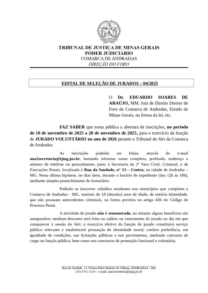 Podem se inscrever cidadãos maiores de 18 anos, residentes nos municípios que compõem a Comarca de Andradas, de notória idoneidade e sem antecedentes criminais, conforme o artigo 436 do Código de Processo Penal.
