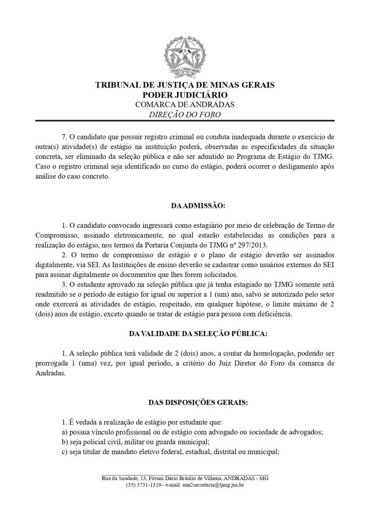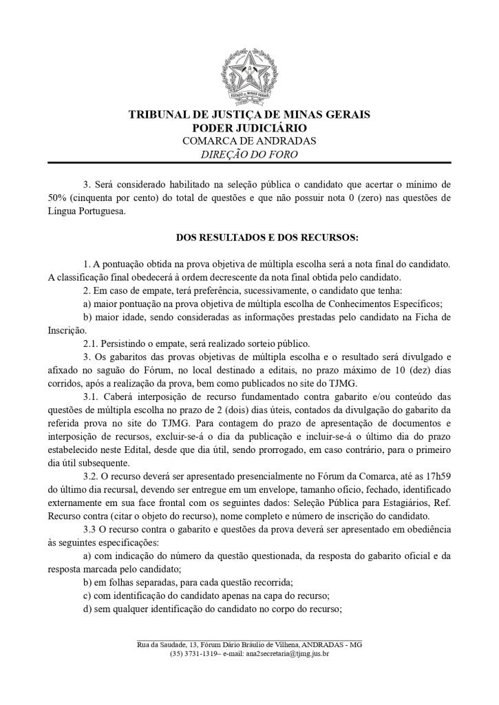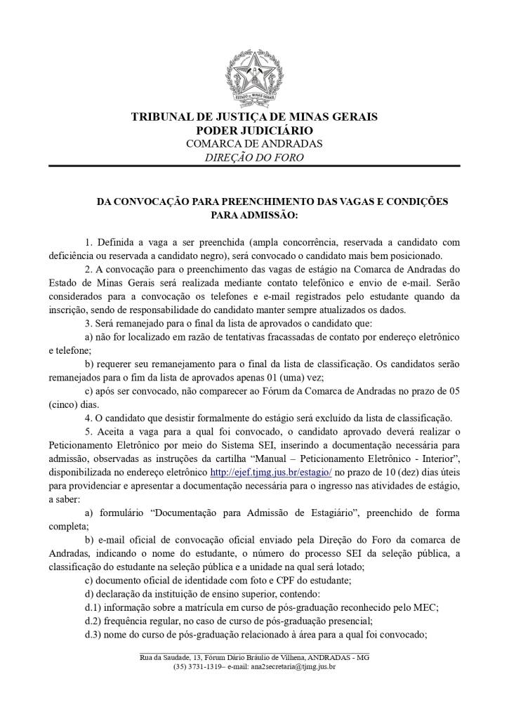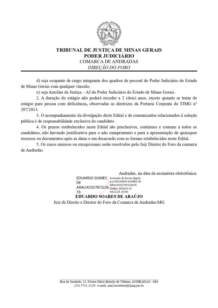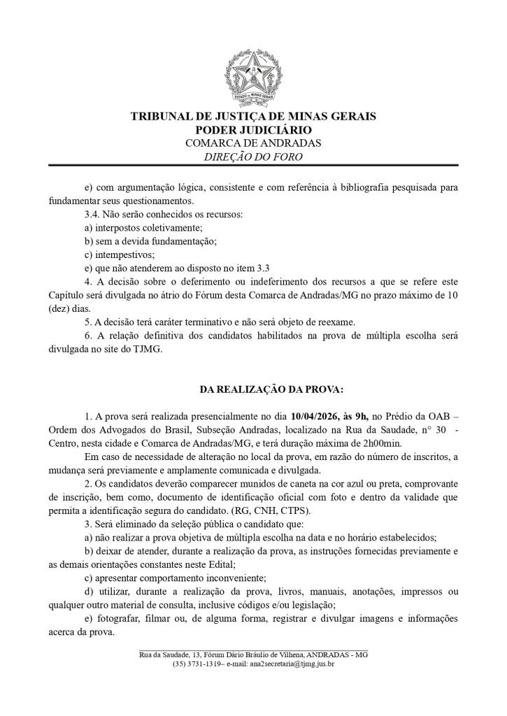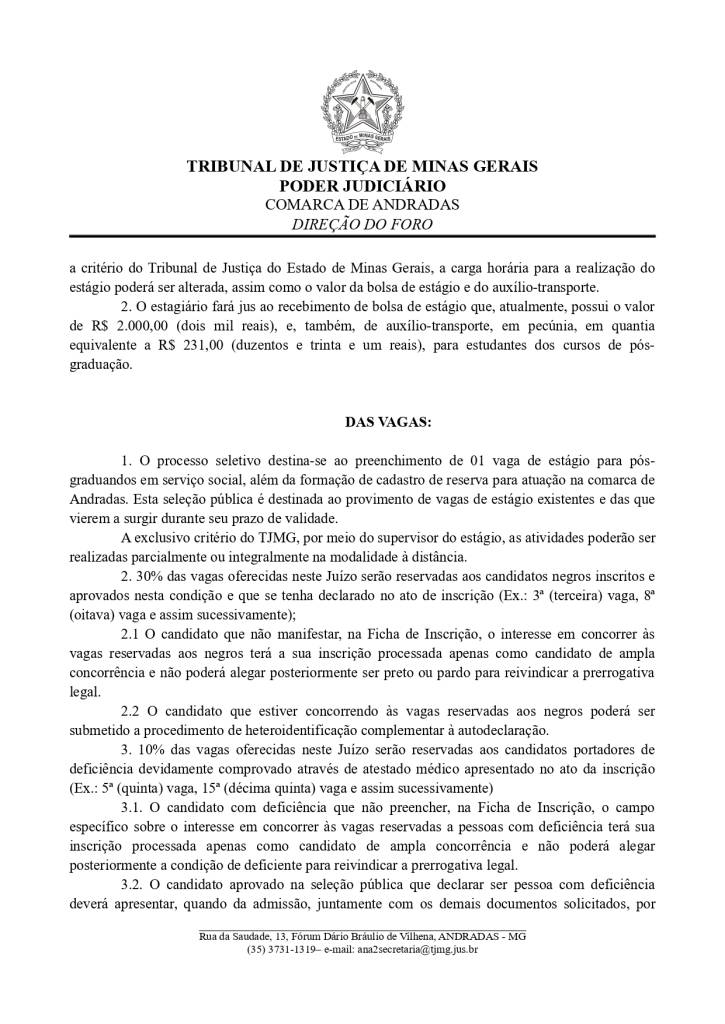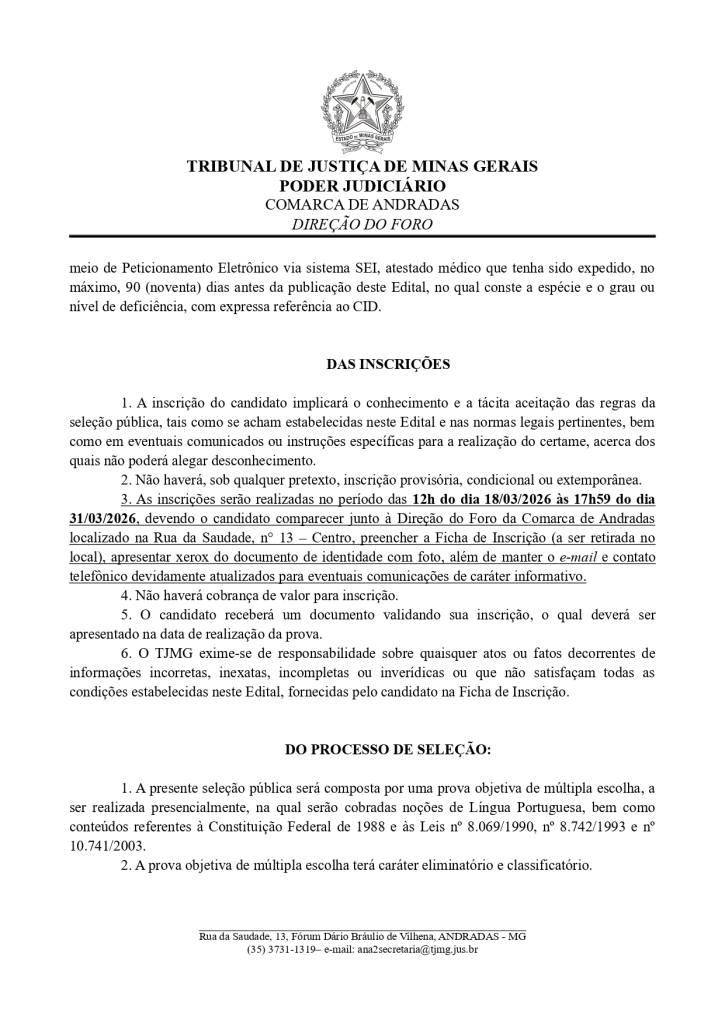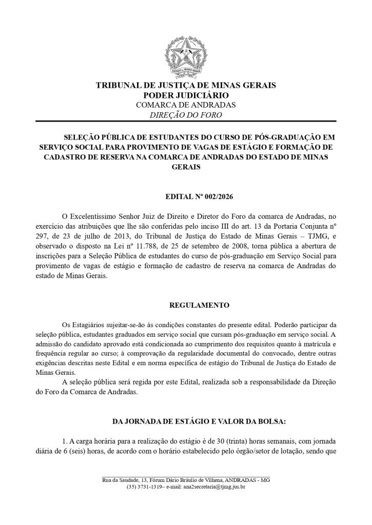 Estarão abertas, de 18 a 31/3/2026, inscrições para seleção de estudantes de pós-graduação em Serviço Social. Os interessados deverão comparecer na direção do foro da Comarca de Andradas e preencher a ficha de inscrição, de acordo com as orientações do edital.  A prova será realizada no dia 10 de abril de 2026, às 9h, no prédio da OAB, Subseção Andradas (Rua da Saudade, nº 30 Centro).